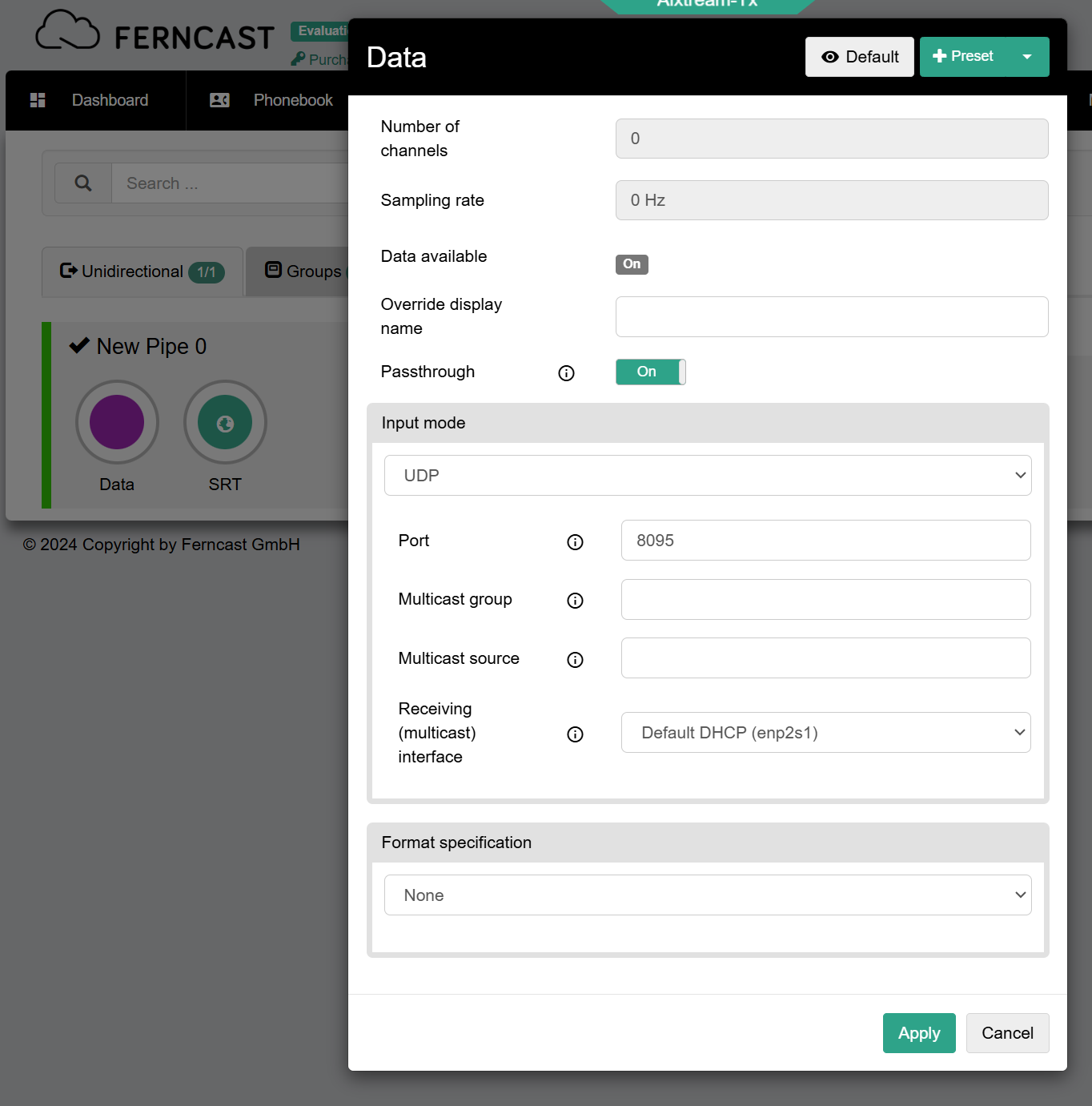 For inputting the EDI into aixtream, use the Data source with Input mode “UDP”. See image below for basic configuration. You must adapt the Multicast configuration for your network. The Port may also need to be changed.