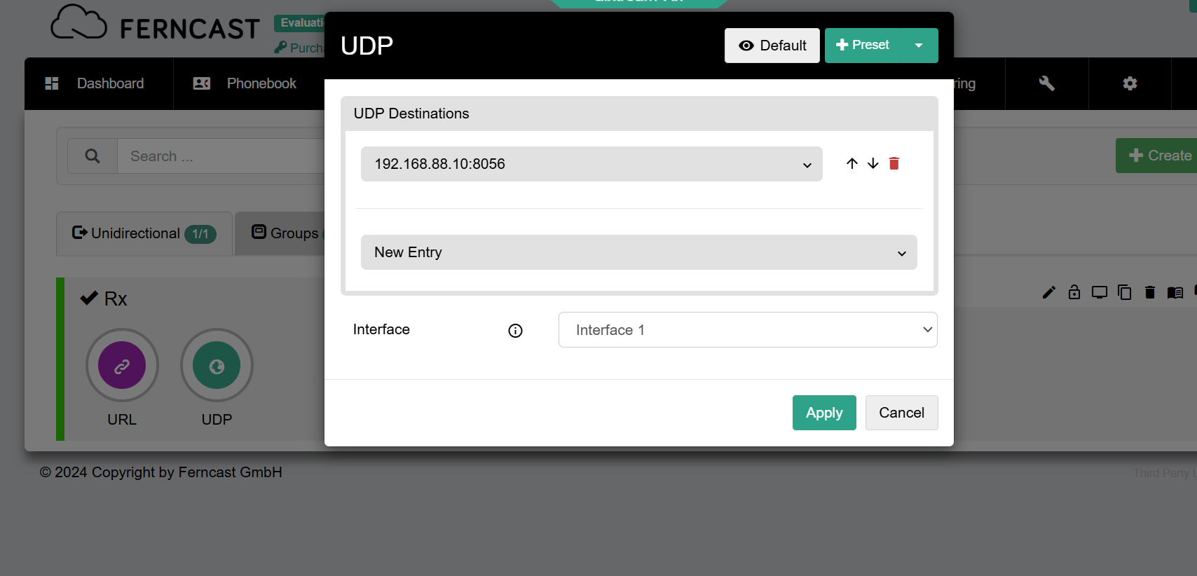 Use the UDP sink element to configure the output of the EDI into the network on the Rx side. Configure Host IP, Port and Interface as normal to establish a UDP connection.