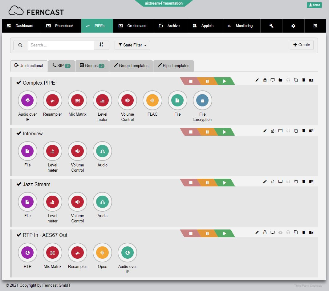 | A PIPE is a graphical depiction of the the entire connection configuration from start to finish, from source to sink. This includes the encoder as well as special audio processing options like loudness control, resampling and remixing, which can be configured together with the rest of the connection. |