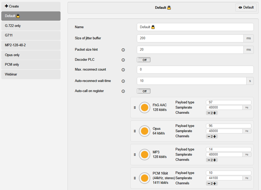 All encoders set as options for this call profile. This is a priority list going from top to bottom (i.e. the top encoder is chosen first during call negotiation, if the remote end rejects it, the next encoder down is tried, and so on.). Bitrate and other encoder-specific settings can be configured by clicking on the element after it has been added to the list. In addition, the following options are available: