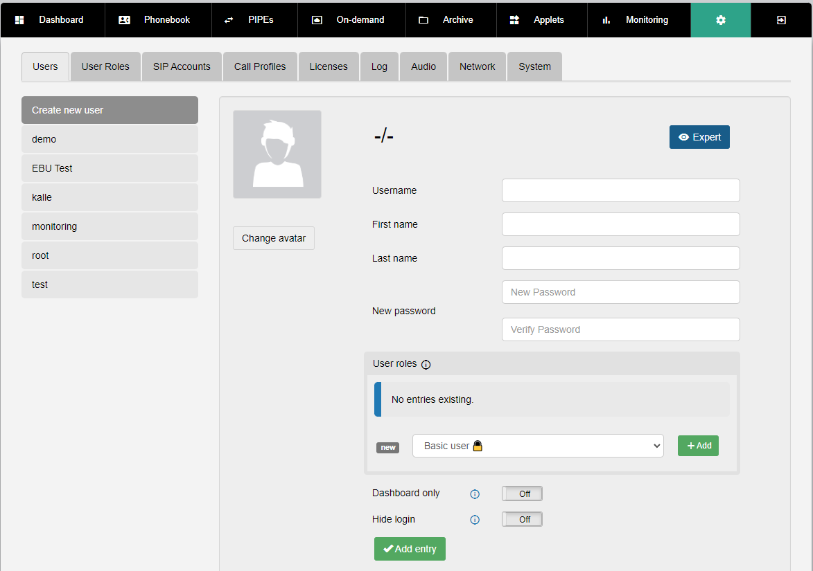 | User roles | Via the dropdown menu to the right you can select a user role and then assign it to this user via click on the + button. Note that multiple user roles can be assigned to one user. |